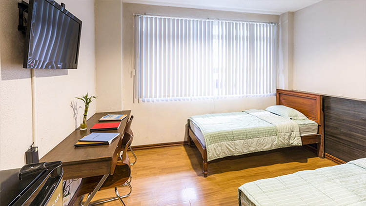4层楼的建筑,从2-4楼是学校的设施(整栋建筑都可以使用WiFi) 2楼是IELTS和TOEIC官方考试中心、女生宿舍、洗衣房、健身中心、公用厨房(可以自己做饭的厨房)、办公室 3楼是餐厅、宿舍、休息室、办公室 4楼是教室、男生宿舍、休息室 楼顶是休息室和吸烟区 |
