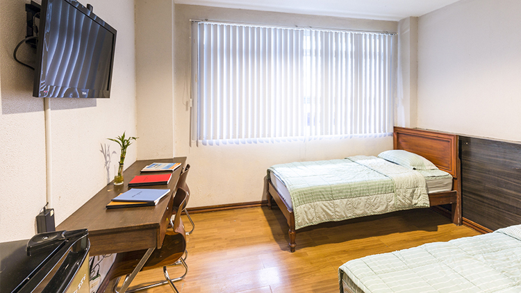 WIFI(房间内也可使用)、单间、2/3人间、床、衣柜、TV、书桌、椅子、厕所(温水淋浴) |