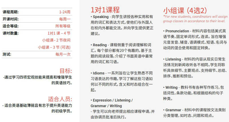 • Speaking Prescription - 此课程旨在帮助学生发现他们的弱点,例如: 发音,文法,等。此课程为文法小组课模式,周一至周四上课,周五进行测试,通过测试帮助学生去发现纠正错误。如果学生在测试当中出错率较高,学生将要重新进行口语测试,因此学生需要重复的练习,复习,因此可以保证测试的顺畅,从而让学生加深记忆。